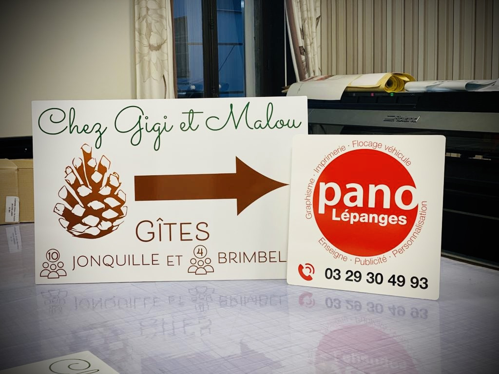 En complément des indications sur l’entreprise (logo, nom, activité), un fléchage et/ou une mention de distance peuvent apparaître sur la pré-enseigne pour guider les clients jusqu’à destination.